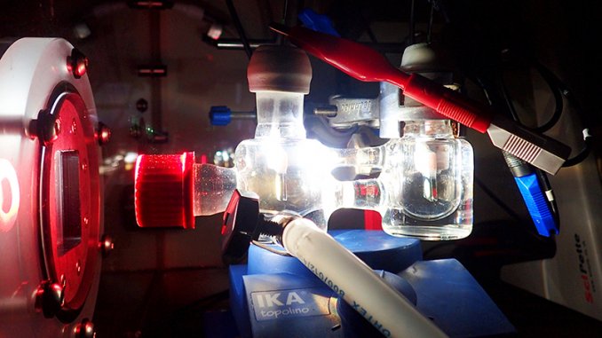 實驗室中模擬太陽光照射的光電化學電池(圖: Katarzyna Sokół)