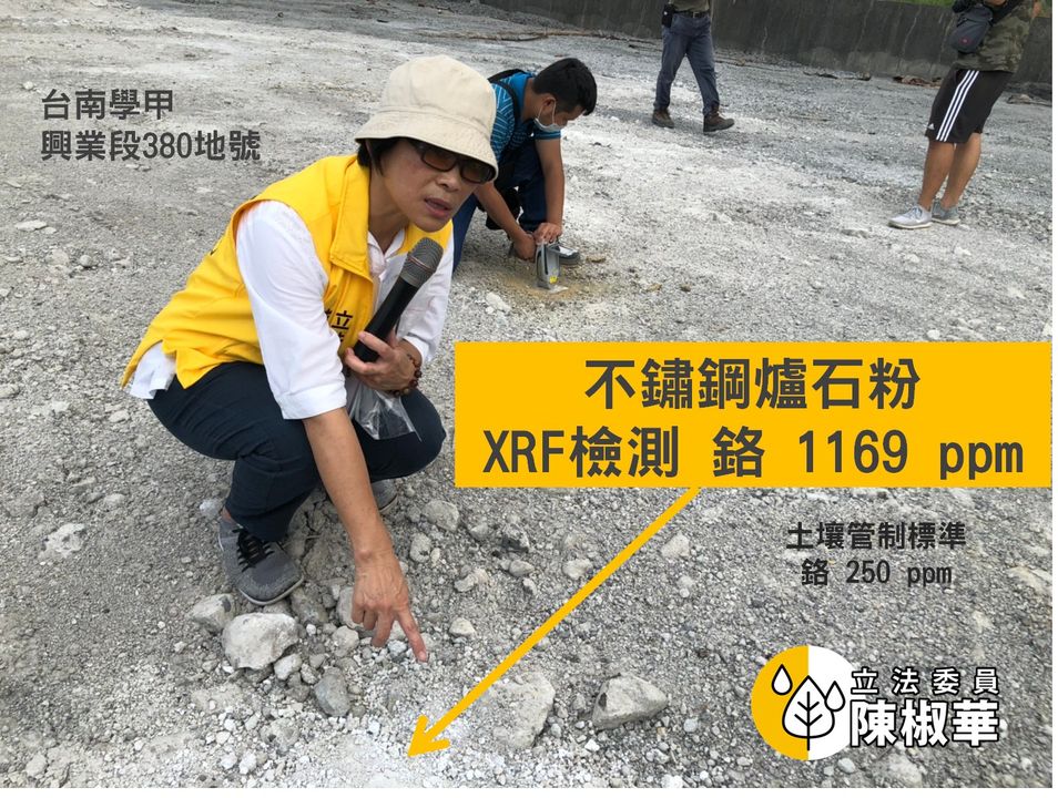 針對立委陳椒華現勘地點(興業段240、380、381、387、388、61、61-1、61-2、61-3等多筆工業土地),環保局事業廢棄物管理科表示,已於9月17日陪同南檢會勘。至於爐碴(石)加工後產品回填土地或堆置於工業用地等行為是否合法,應視時空背景的法令規定。