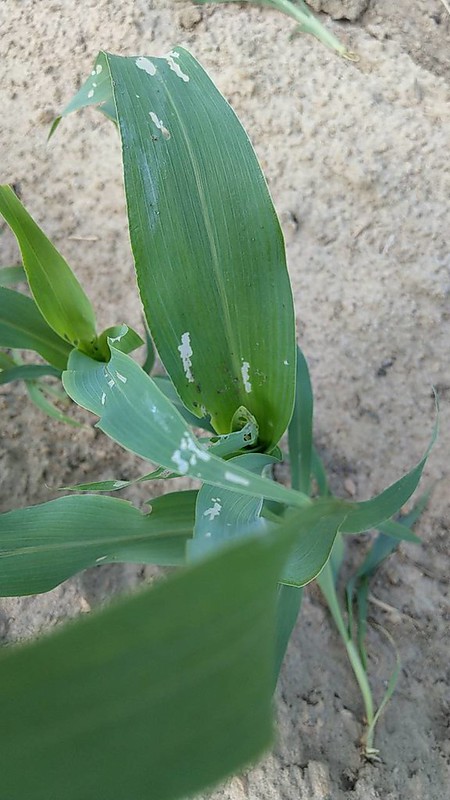 高粱葉片遭幼齡蟲體蛀孔,老齡幼蟲則鑽入植株生長點。金門縣政府提供