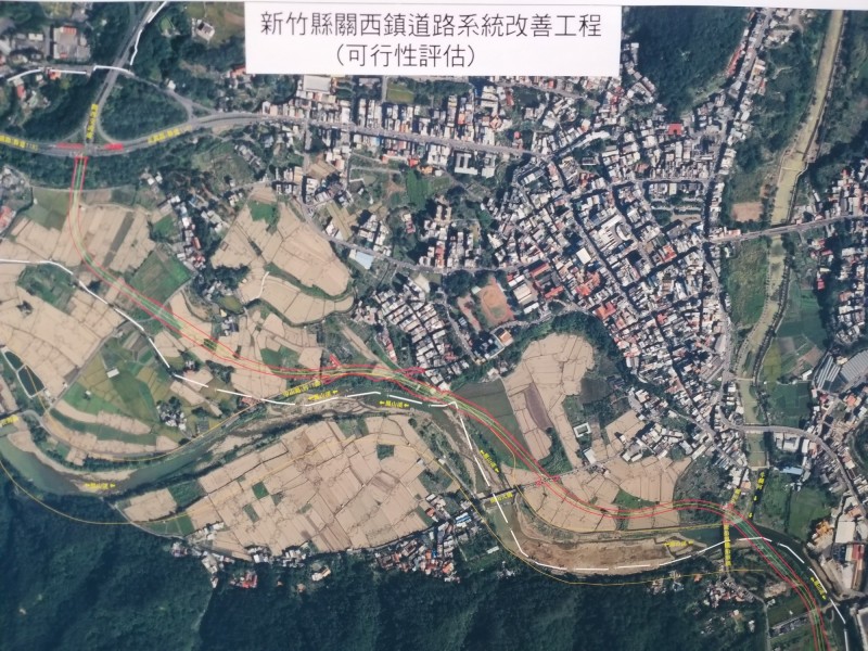 「關西鎮道路系統改善工程(可行性評估)」外環道工程路線圖(紅線部分)。(新竹縣政府提供)