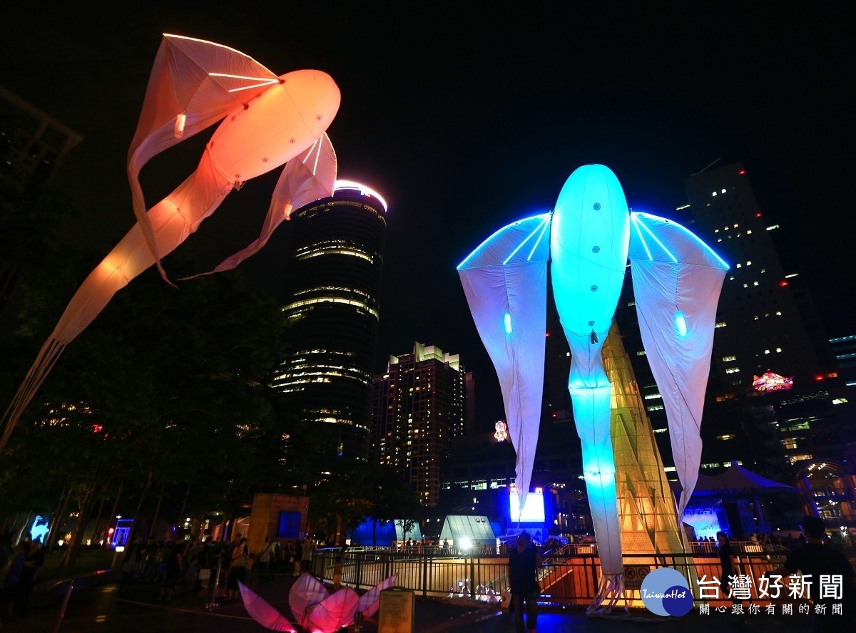 來自法國的充滿詩意的光之鳥,在現場優遊飄舞,不時灑落多彩斑斕的燈光搭配奇幻音樂,隨著音樂擺動