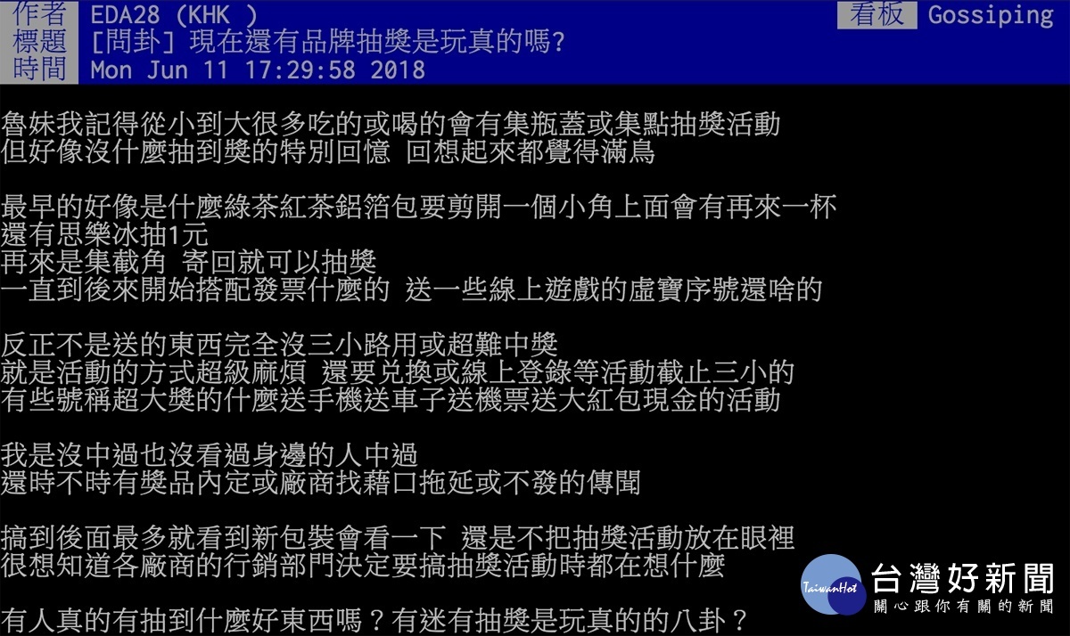 日前有位網友於PTT八卦版發文提問:現在還有品牌抽獎是玩真的?他直言小時後參加的活動真實性高很多,至少可以直接看到有沒有中獎;現在的抽獎活動,略為麻煩需要上網登錄等待抽獎,時有耳聞獎品內定或廠商找藉口不給。