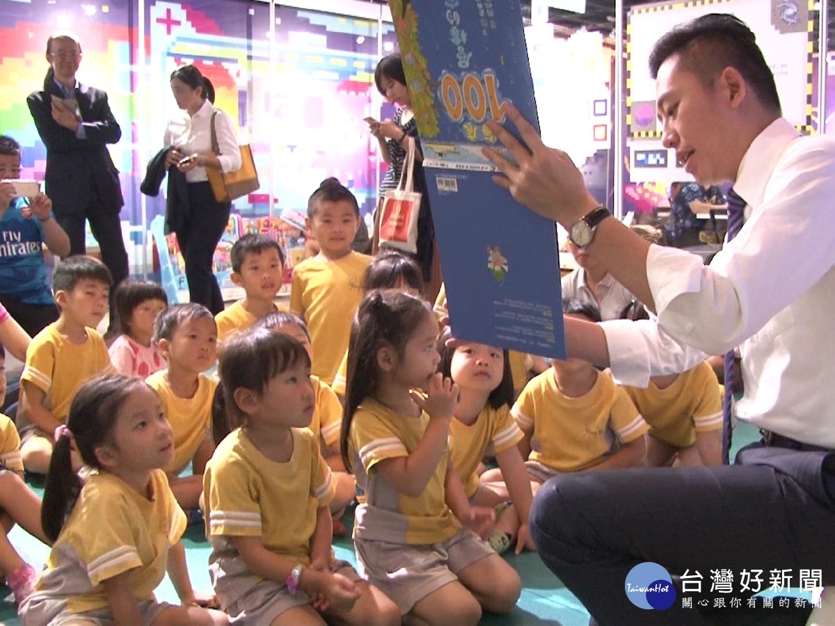 除了數位藝術空間以外,還有適合親子同樂的說故事空間,林智堅放下公務,走到幼兒園二十多位孩子的前面,放輕聲調,陪著孩子一起讀童話故事書。林智堅有三個孩子,他指出平常只要有時間,就會讀故事書給孩子聽,也因此這次面對二十多位小朋友,林智堅展現出溫馨的一面,扮演起說故事的叔叔,唸書給孩子聽。
