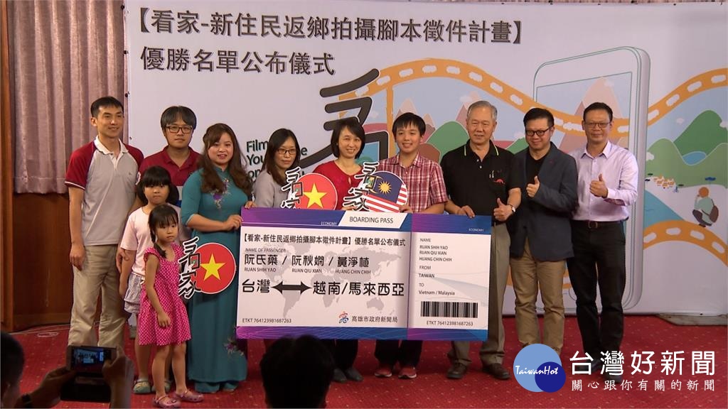 一張大大的機票紙板,上頭寫著台灣飛往越南和馬來西亞,獲獎的三位新住民將在高雄市政府的贊助之下,返回家鄉拍攝影片,製作「看家-新住民返鄉拍攝」合輯節目。