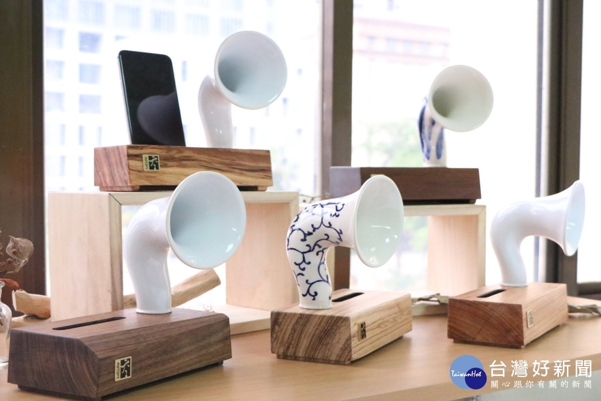 崑山科大視傳系助理教授鄭明輝結合視傳系、視訊系學生共組新創團隊,成立米秝文化創意公司,推出〈空Mellow免插電擴音喇叭〉作品。鄭明輝助理教授表示,該作品是不需電力即可擴音的創業造型工藝品,將木質音箱及陶瓷造型喇叭做結合,利用音箱的共振原理,使手機的聲音透過音箱及陶瓷特性,傳導出無損且優化的聲音,提供高品質的擴音效果,亮麗外型十分搶眼。