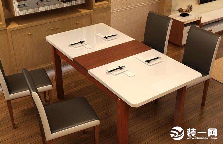 3、可伸縮餐桌,從字面上理解就是能夠調節長度的桌子,是現代許多小戶型家庭購買的對象。因為這類戶型面積不夠寬大,所以在吃飯的時候能夠將其拉出,吃完飯以後又可以推進去,使其還原。但可伸縮餐桌一般是放在固定地點,不時常移動的。